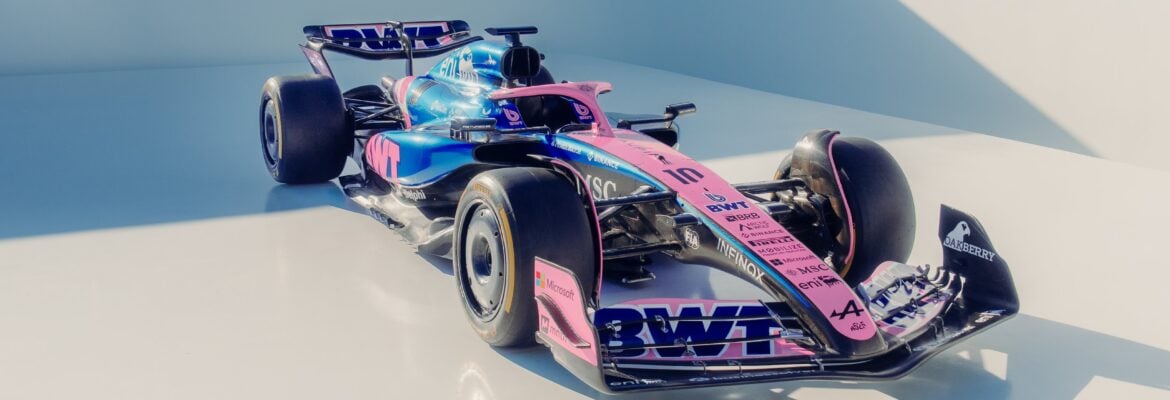 Então, mostrando as cores para o campeonato da F1, o time francês decidiu misturar as duas cores de 2024: o azul e o cor de rosa. No halo, bico, detalhe na traseira e no BWT no sidepod, vem com o rosa, e o restante vem em azul.
