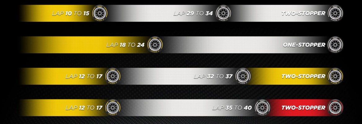 Para os pilotos na segunda metade do grid, as estratégias de duas paradas com todos os três compostos são possíveis, começando com médios e alternando para duros e, possivelmente, para macios nas últimas voltas.