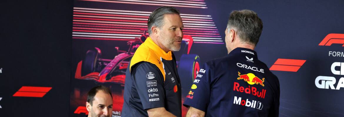 O chefe da Red Bull Racing, Christian Horner, entrou no clima descontraído do final de semana em Miami e respondeu com leveza à provocação feita por Zak Brown, CEO da McLaren, na sexta-feira antes do GP de Miami de Fórmula 1. Brown apareceu bebendo de uma garrafa com o rótulo ‘tire water’ (água de pneu), uma referência às suspeitas levantadas pela Red Bull no ano passado sobre o controle de temperatura dos pneus usados pela McLaren.