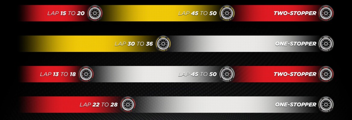 Essa estratégia envolve começar a corrida com os pneus macios, mudar para os médios e, finalmente, voltar aos macios. Pirelli também afirma que uma estratégia de parada única, começando nos pneus médios e terminando nos duros, pode ser uma boa opção, desde que o clima permaneça seco.