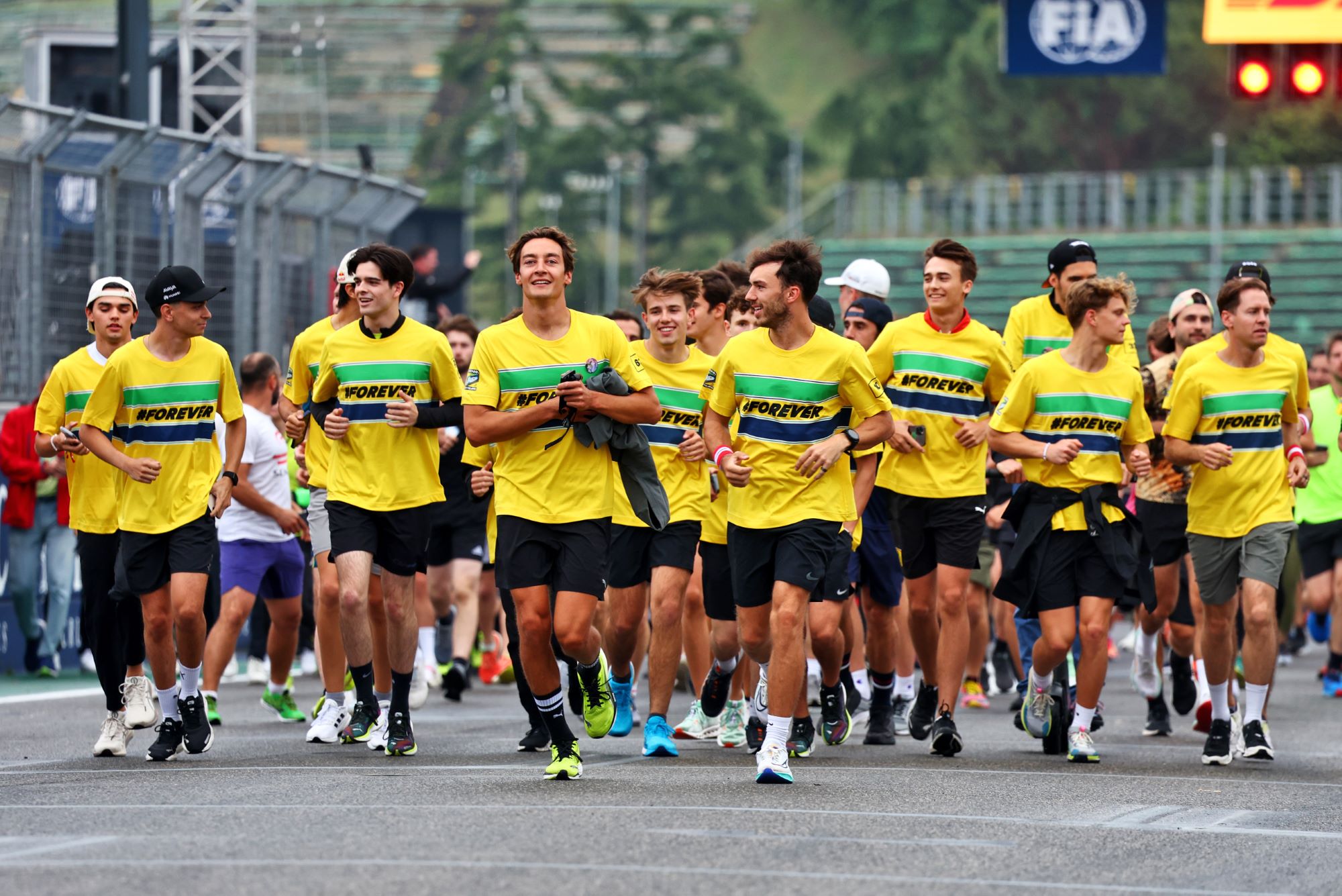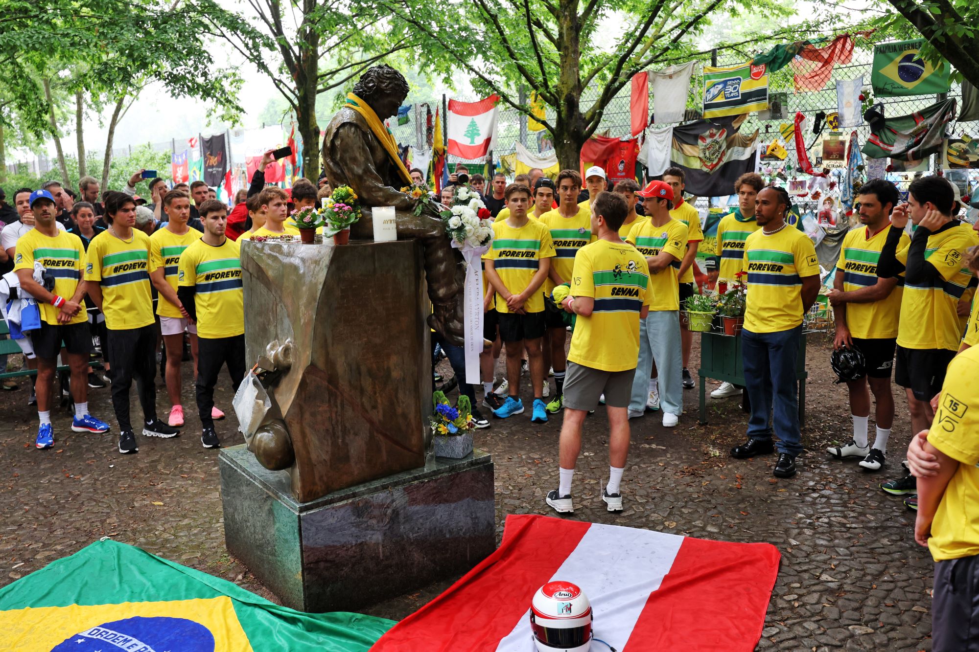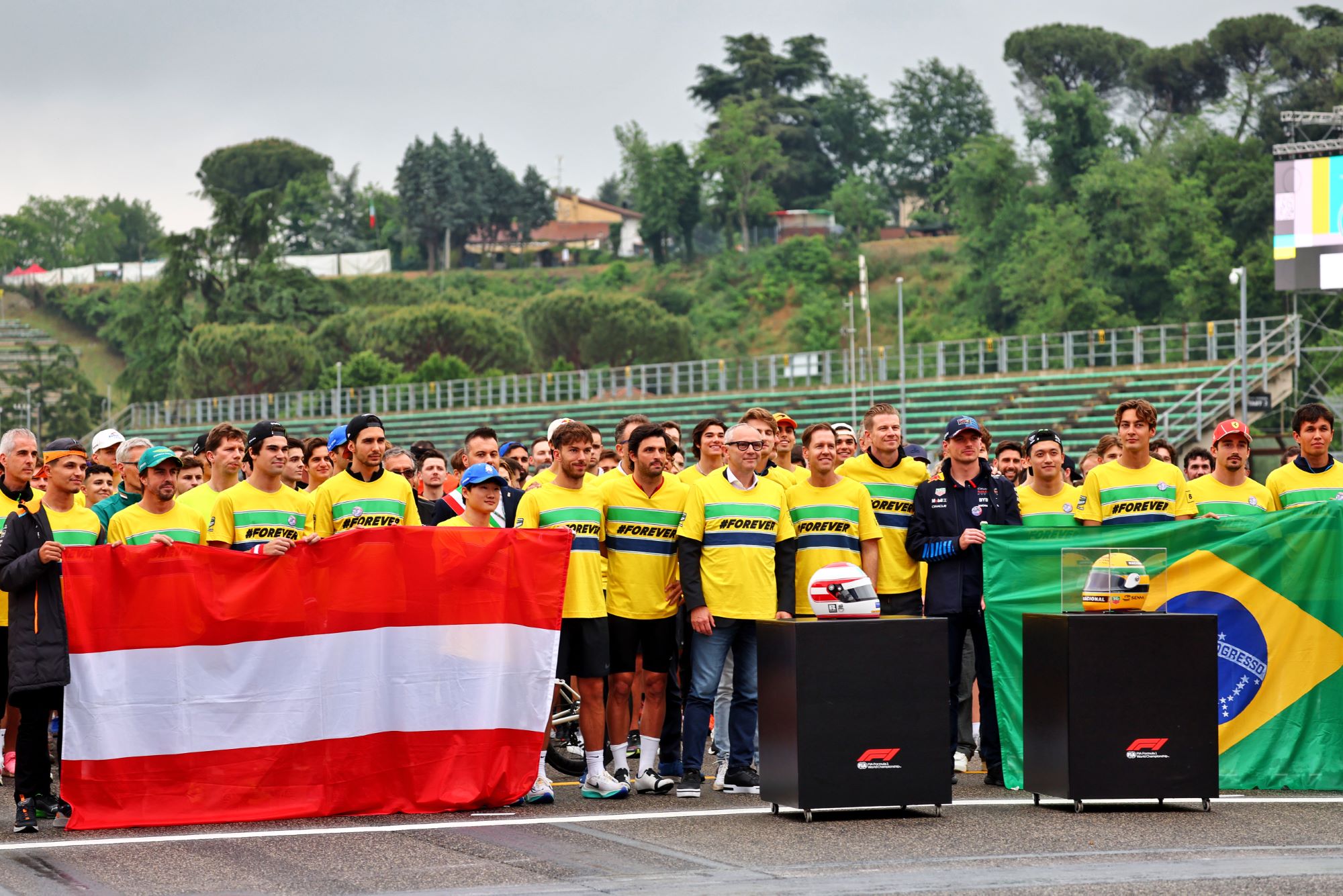 Todos os pilotos do grid da Fórmula 1 participaram do tributo, segurando as bandeiras do Brasil e da Áustria, em uma demonstração de respeito e memória aos pilotos. Além disso, a maioria dos pilotos e figuras públicas presentes vestiam uma camisa com a inscrição “#forever”, simbolizando a lembrança eterna aos heróis do esporte.