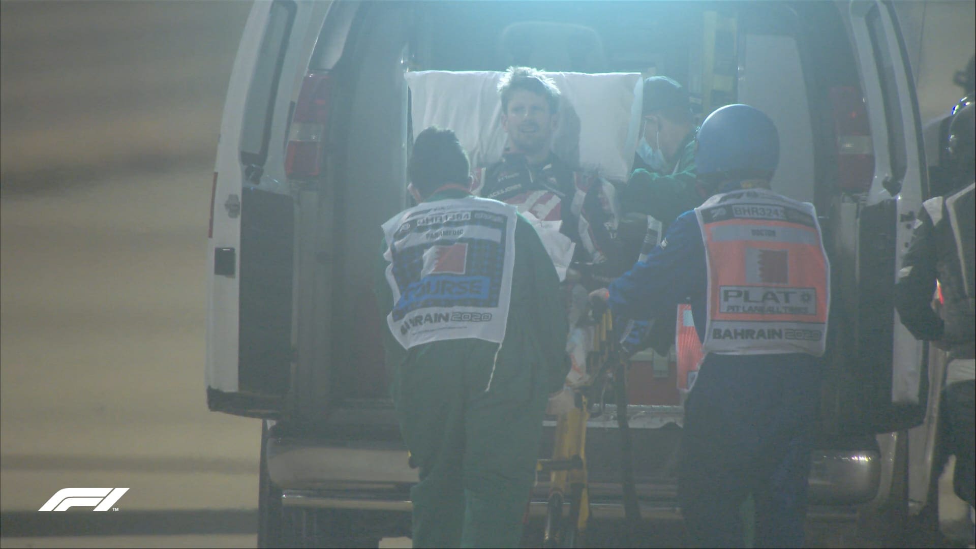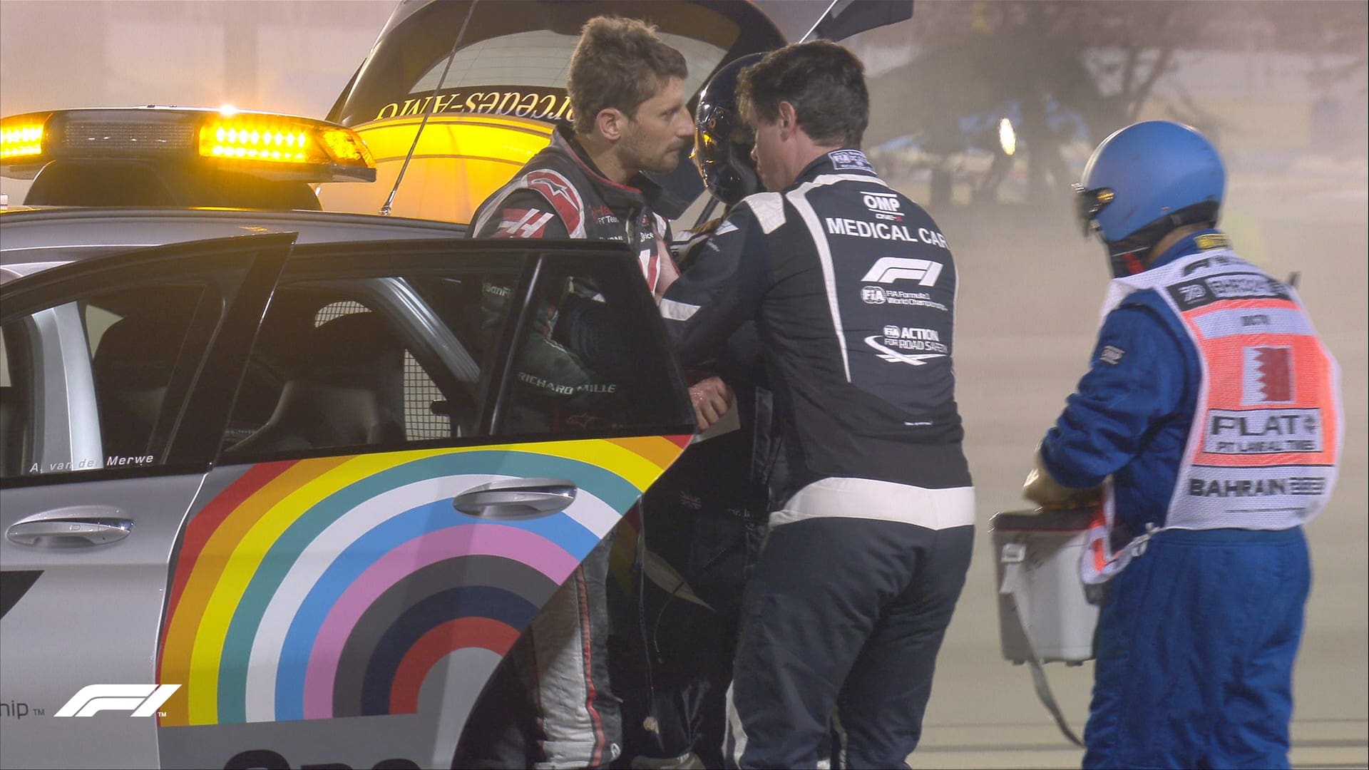 Grosjean ficou preso em uma enorme bola de fogo, antes de ser retirado pelo médico F1. Segundo informações da equipe Haas, Grosjean sofreu pequenas queimaduras e ele já foi encaminhado para o centro médico do circuito.