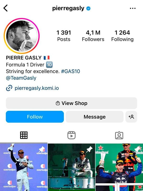 Em oitavo colocado está Pierre Gasly (@pierregasly), automobilista francês que está na Fórmula 1 pela equipe Alpine, com 4 milhões de fãs e seguidores, vem conquistando o público por seu talento no Grid.