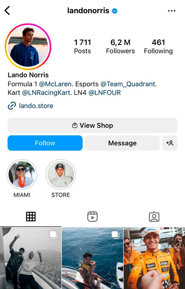 Lando Norris (@landonorris) com 6,2 milhões ficou com o quinto lugar de pilotos de fórmula 1 mais seguidos no Instagram. Norris conseguiu doações para Fundo de Resposta Solidária à COVID-19 em 2022 durante um evento de streaming online.
