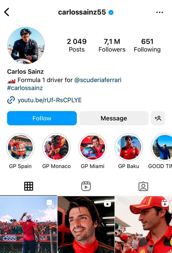 Filho do bicampeão mundial de Rali, Carlos Sainz, Carlos Sainz Jr (@carlossainz55) ocupa o quarto lugar de mais seguidos do Instagram com 7,1 milhões de seguidores.