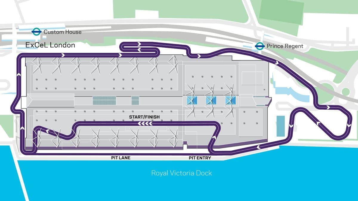 Passando por locais como a Royal Docks e o centro de exposições ExCel London, os pilotos vão percorrer um circuito indoor/ outdoor de 2,4 km no sentido horário da Royal Victoria Dock.