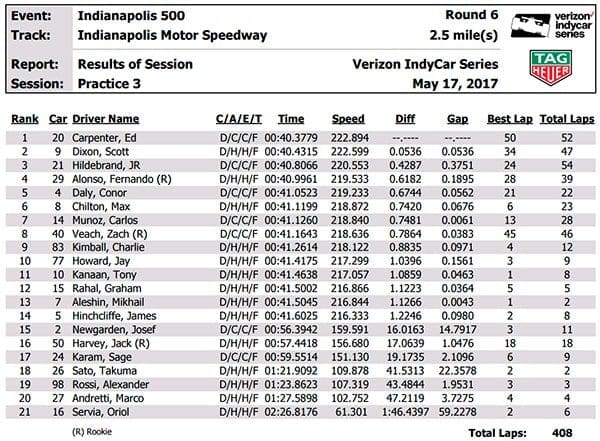 Ed Carpenter liderou o terceiro treino para as 500 Milhas de Indianápolis, com Fernando Alonso melhorando para conseguir um impressionante quarto lugar.