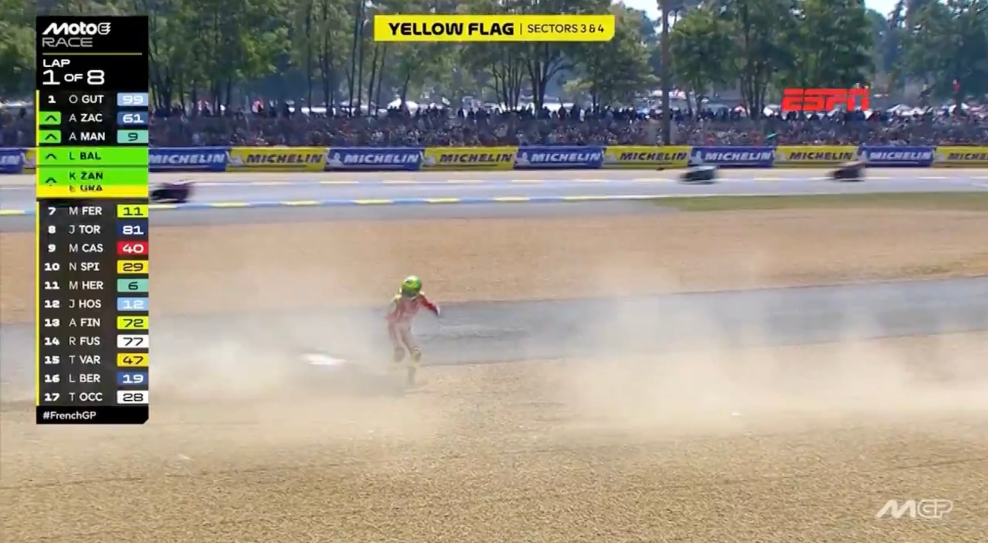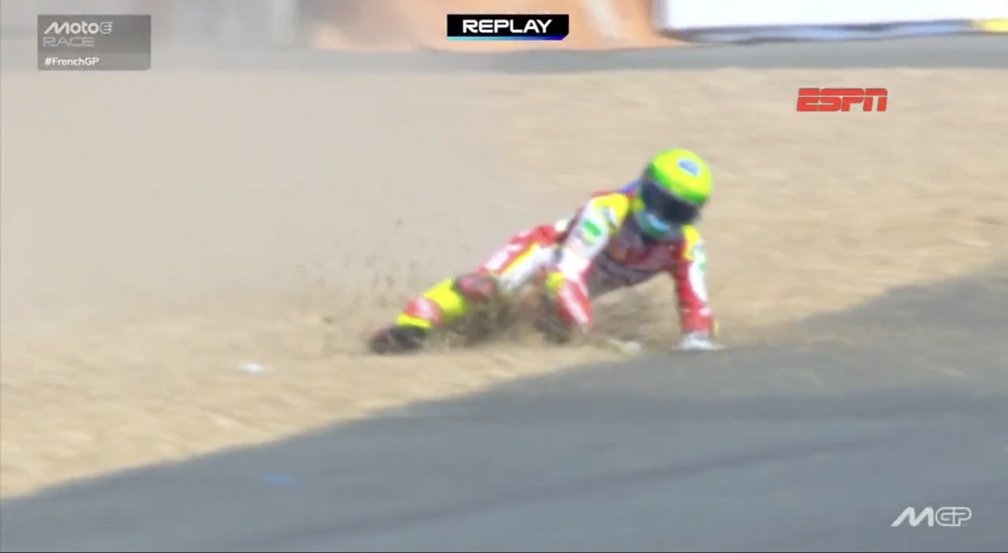 Granado perdeu o controle da moto na saída da curva e acabou indo ao chão. Quando tentava se levantar para retornar à prova, foi atingido pela moto de Raffaele Fusco, que vinha logo atrás e não conseguiu desviar. O impacto foi violento. Fusco também caiu, mas conseguiu se recompor rapidamente. Já Granado permaneceu no solo e precisou ser removido de maca pelos serviços médicos do circuito de Le Mans.