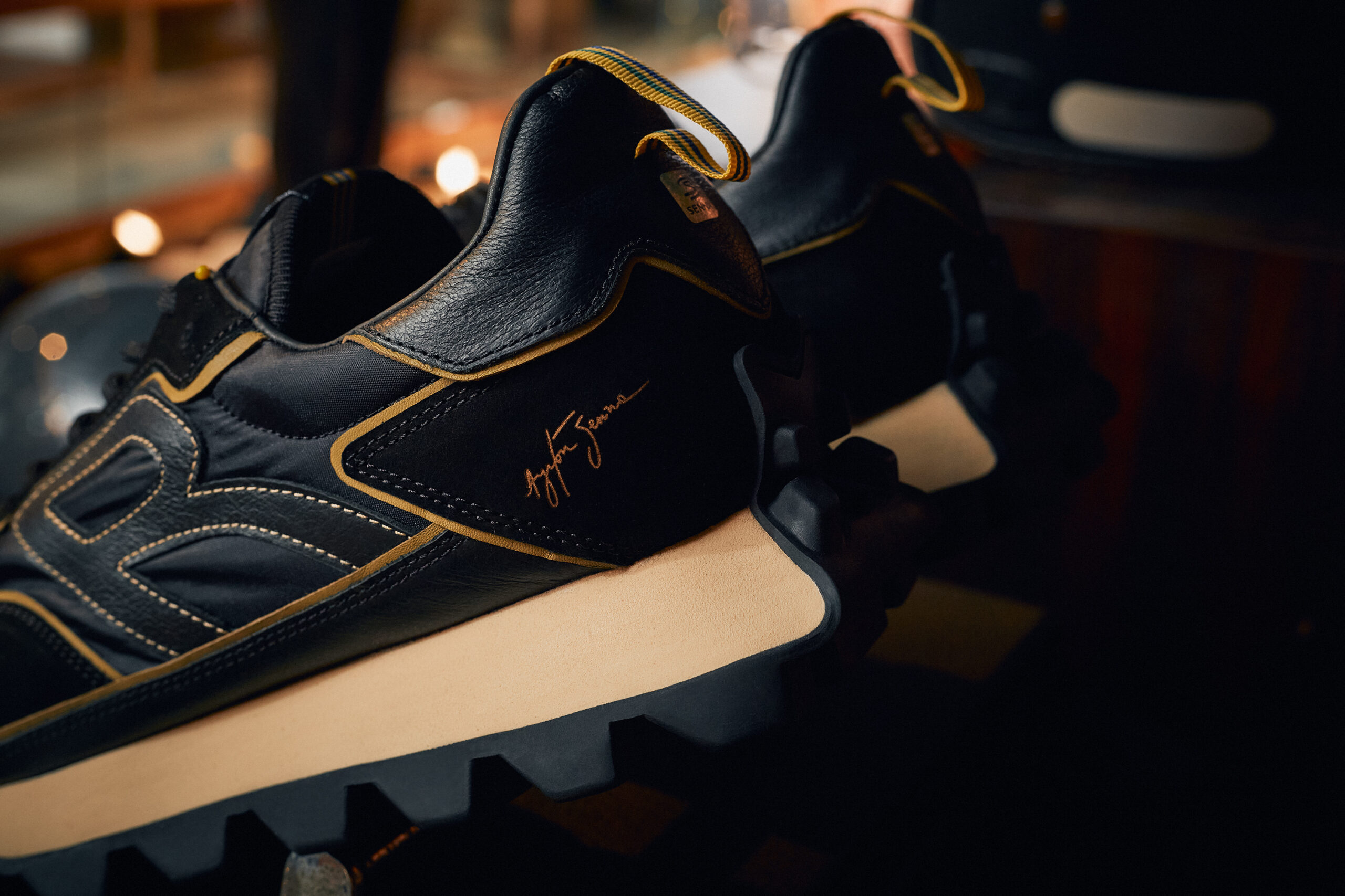 Já na Reserva Go – marca de calçados e acessórios da Reserva –, os modelos Yankee e Heritage foram os escolhidos para fazer parte da collab. Os dois modelos ganharam uma versão em preto e amarelo, e outra em vermelho e branco, inspirados nas cores dos modelos dos carros mais icônicos do piloto, além de receberem a assinatura do ídolo brasileiro do automobilismo e uma etiqueta especial para a lingueta nas cores do capacete Senna. O modelo Heritage em vermelho e branco ainda ganhou uma versão infantil para que pais e filhos possam se conectar através da paixão pela Fórmula 1.