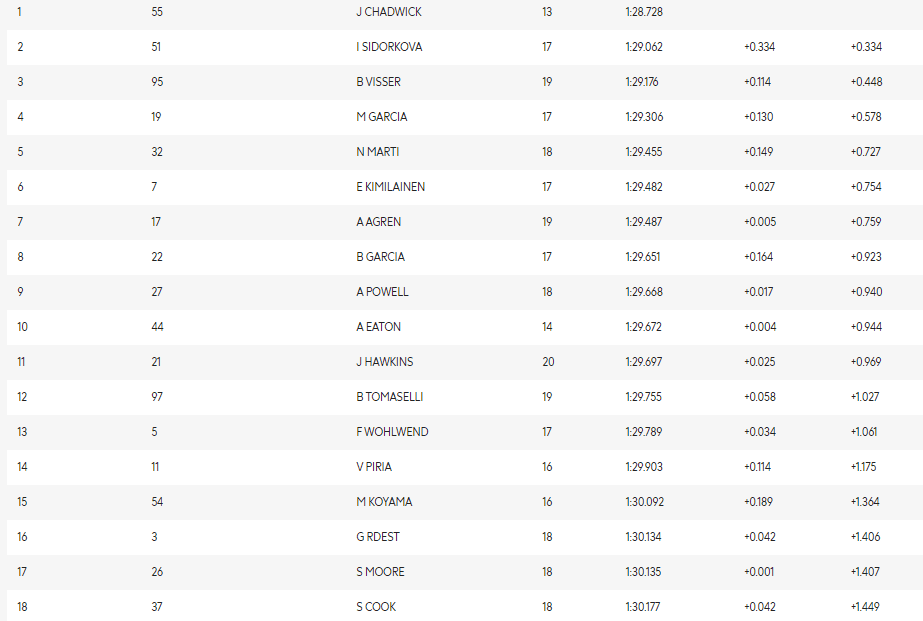 A ordem da sessão neste momento era Chadwick em primeira, com Irina Sidorkova 0s387 mais lenta. Beitske Visser, Nerea Martí, Marta Garcia, Kimiläinen, Ayla Agren, Belen Garcia, Powell e Wohlwend completavam o top-10.