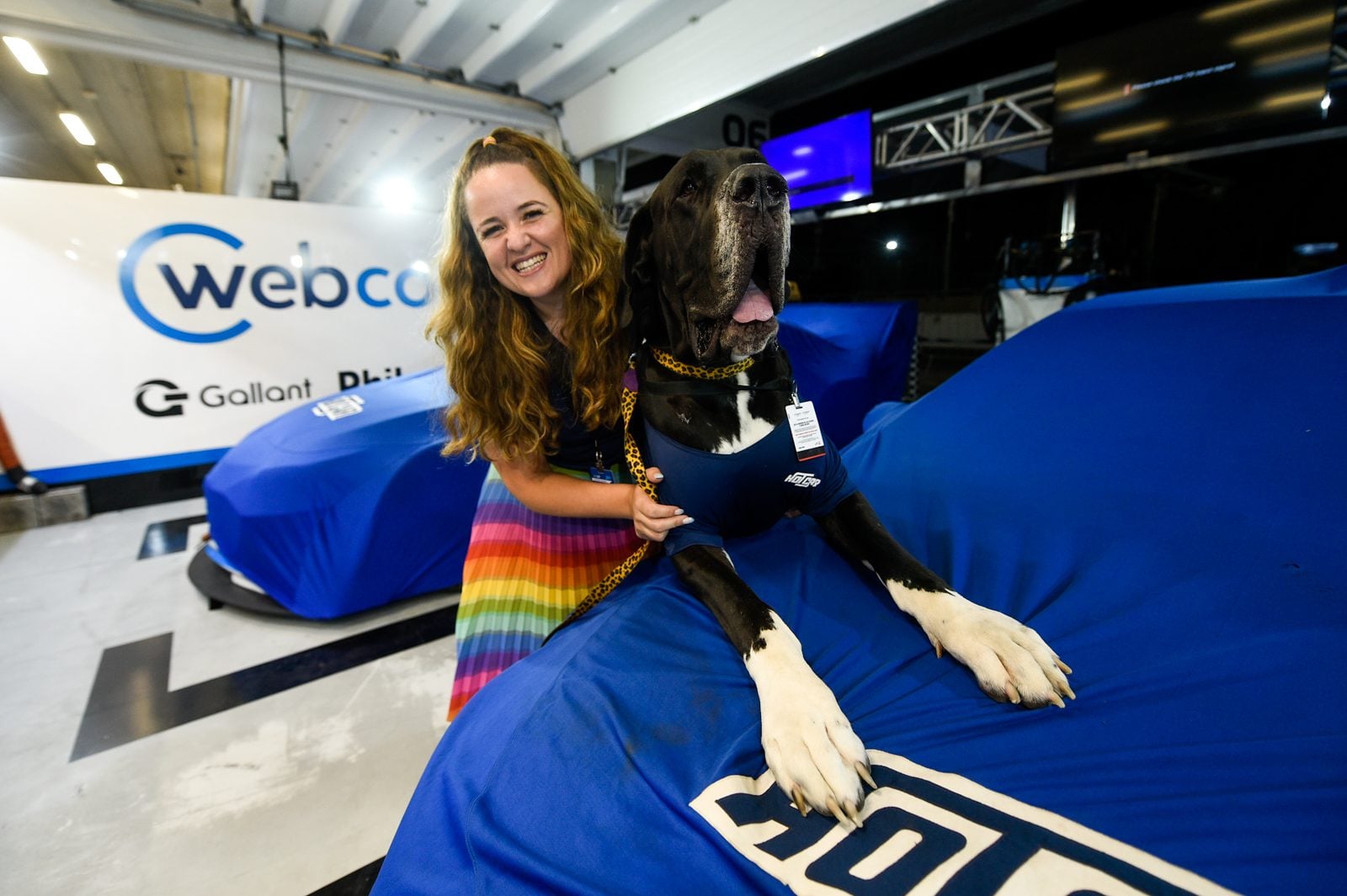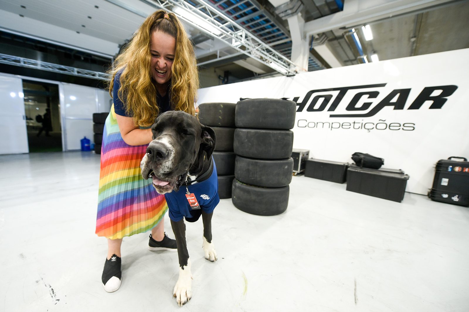 O cão, que é da raça Dogue Alemão e tem um ano e meio, esteve no Autódromo José Carlos Pace com todos os direitos possíveis. Além de literalmente vestir a camiseta da equipe, ainda ganhou uma credencial de boxes para poder transitar tranquilamente.